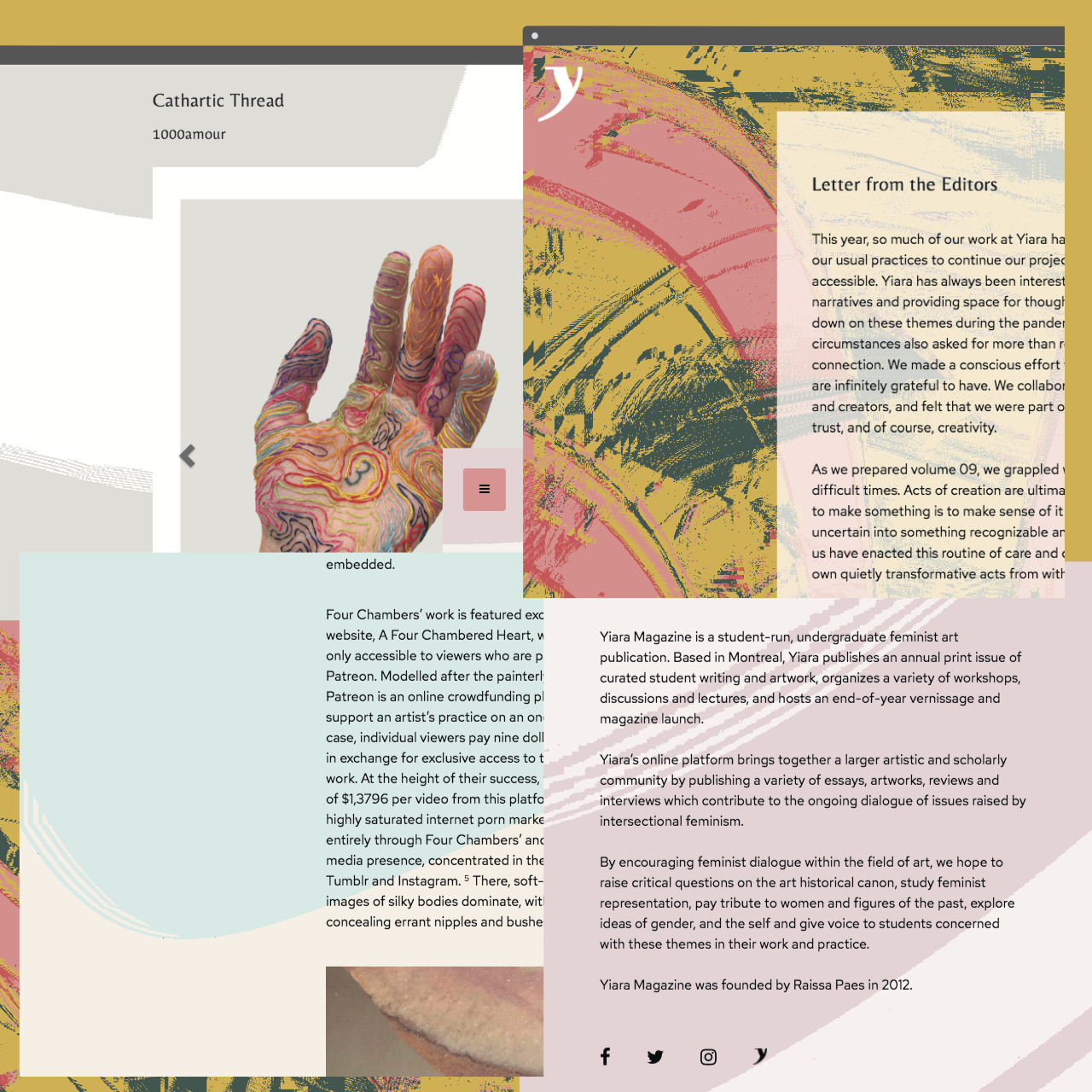 Diseño y programación del número 09 de Yiara Magazine, una publicación de arte feminista universitaria dirigida por estudiantes con sede en Montreal. Consulta la página web en el siguiente enlace: Yiara09